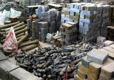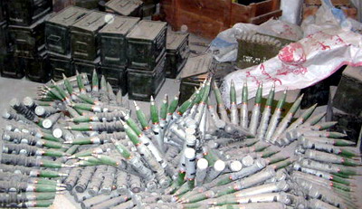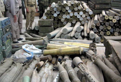 المستودع الأول احتوى أسلحة خفيفة ومتوسطة ومئات الآلاف من الذخائر المتنوعة والقاذفات والأكياس المليئة بالعبوات المتفجرة، ليس ذلك فحسب فعلى جنبات المستودع الشاسع وزواياه يصل ارتفاع الكومة الواحدة من الصناديق الخشبية المليئة بالذخائر المتنوعة إلى نحو (3) أمتار بما يوازي ارتفاع دور واحد في منزل.