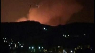 وأظهرت لقطات مصورة بثها ناشطون على الإنترنت وقوع سلسلة من الانفجارات القوية أحدها أضاء سماء دمشق وأدى إلى تصاعد عمود من اللهب وانفجارات أخرى.