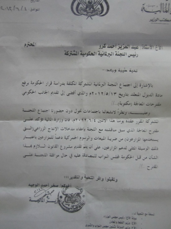 وعليه، ونظراً لانشغالنا باجتماعات تحول دون حضورنا اجتماع اللجنة المشتركة المقرر عقده يومنا هذا الاثنين 4/6/2012م، فإن وزارة المالية تؤكد على مقترح المعالجة الذي سبق مناقشته مع اللجنة بإعفاء مدخلات الإنتاج الزراعي (التي يستخدمها المزارعون) من ضريبة المبيعات والرسوم الجمركية دعماً للمزراعين باعتبار ذلك الوسيلة المثلى لدعم المزراعين، على أن يتم تقديم مشروع القانون اللازم بهذا الشأن من قبل الحكومة لمجلس النواب للمصادقة عليه في حالة موافقة اللجنة على المقترح.