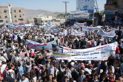 مسيرة جماهيرية حاشدة في تعز دعماً للأمن والاستقرار(صور) شهدت محافظة تعز مسيرة جماهيرية حاشدة دعماً للأمن والاستقرار والتنمية تدفقت إلى إمام ديوان عام المحافظة بمشاركة جميع أبناء محافظة تعز . وأكدت المسيرة تأييدها للأمن والاستقرار والتنمية ودعم جهود المحافظ شوقي احمد هائل التنموية والأمنية والخدمية والإدارية ، والتغيير المنشود وبما يعيد للمحافظة أمنها واستقرارها وألقها الحضاري والثقافي. |