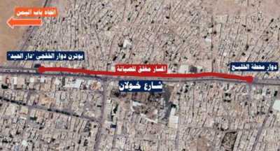 الأحد, 19-أكتوبر-2025المؤتمرنت - أعلنت شرطة المرور بأمانة العاصمة، مساء اليوم، عن إغلاق مروري مؤقت في شارع خولان، المسار الأيمن المؤدي من الحثيلي باتجاه باب اليمن، تحديداً من سوق الخليج وحتى يوترن دار الحيد بعد جولة الخفجي، وذلك نتيجة تنفيذ أعمال صيانة شاملة للطريق.