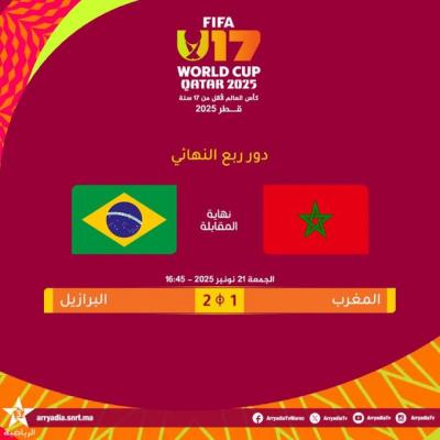 الجمعة, 21-نوفمبر-2025المؤتمرنت - ودع منتخب المغرب تحت سن 17 عام بطولة كأس العالم للناشئين المقامة في قطر بخسارته امام البرازيل بنتيجة هدفين مقابل هدف وجاء هدف البرازيل في الدقيقة الأخيرة من الوقت المضاف