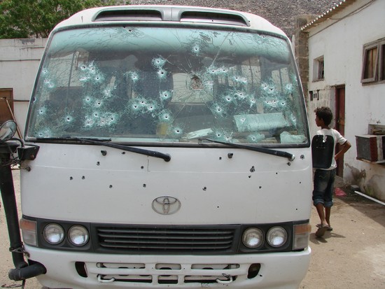 الحادث الإرهابي على حافلة قيادة المنطقة الرابعة (صور) استشهد(6) موظفين وإداريين من الشعب الرياضية العسكرية التابعة للمنطقة العسكرية الرابعة وموظفين في مستشفى باصهيب العسكري ومنهم امرأتين وعمال المطابع وجرح تسعة أفراد آخرين بجروح مختلفة جراء إقدام إرهابيين من تنظيم القاعدة الضالين عند الساعة السابعة والنصف صباحا من اليوم الأحد بإطلاق وابل من النيران الكثيفة وبشكل عشوائي على الباص الذي كان يقلهم وهم في طريقهم إلى العمل.. وأوضح مصدر امني بأمن محافظة عدن(جنوب اليمن) بأن الحادث الإجرامي والجبان الذي أقدمت على ارتكابه تلك العناصر الإرهابية التي تحمل بصمات تنظيم القاعدة كان بجولة السعيدي بمديرية الشيخ عثمان محافظة عدن ولاذوا بالفرار بعد ارتكاب جريمتهم الشنعاء.. المؤتمرنت ينشر صور للحادث الإرهابي على حافلة قيادة المنطقة الرابعة |