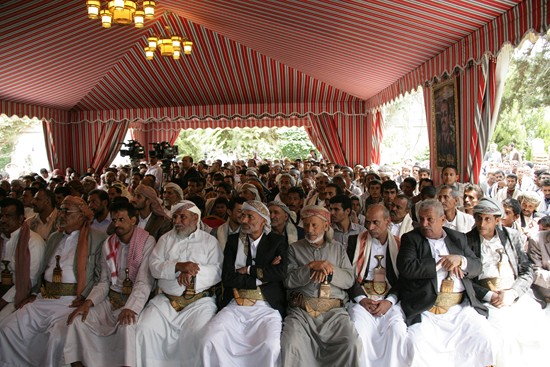 رئيس المؤتمر يستقبل وفداً من أبناء مأرب (صور) استقبل الرئيس السابق للجمهورية الزعيم علي عبدالله صالح رئيس المؤتمر الشعبي العام في منزله بالعاصمة صنعاء صباح اليوم وفداً من أبناء محافظة مأرب الحضارة والتاريخ يتقدمهم العلماء والمشائخ والأعيان والوجهاء وقيادات وأعضاء من المؤتمر الشعبي العام وأحزاب التحالف الوطني الديمقراطي، الذين قدموا له التهاني القلبية لنجاته مما كان يخطط له الحاقدون المتآمرون الذين لم يكتفوا بالجريمة النكراء والإرهابية الغادرة التي استهدفت الزعيم وقيادات الدولة في مسجد دار الرئاسة أثناء تأديتهم لفريضة صلاة أول جمعة من شهر رجب الحرام الموافق الثالث من يونيو عام 2011م، وذلك في تحدٍ صارخ لتعاليم الدين الإسلامي الحنيف وللقوانين والأنظمة، والأعراف وتقاليد وأخلاق أبناء اليمن وشعبه الأصيل شعب الحكمة والإيمان. |