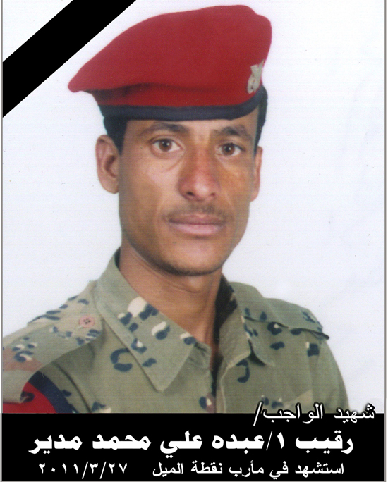 (صور شهداء اعتداءات عصابات أولاد الأحمر والقاعدة والمشترك)(3) قال تعالى(وَلَا تَحْسَبَنَّ الَّذِينَ قُتِلُوا فِي سَبِيلِ اللَّهِ أَمْوَاتًا بَلْ أَحْيَاءٌ عِنْدَ رَبِّهِمْ يُرْزَقُونَ)..صدق الله العظيم .. خلال العام الجاري 2011م وفي إطار الأزمة السياسية التي تشهدها البلاد خسرت اليمن شهداء بالمئات اغتالتهم يد الإرهاب والتطرف التي لا تعرف لغة للتخاطب سوى العنف الذي تشارك في صنعه تنظيم القاعدة الإرهابي ،ومليشيات الإخوان المسلمين في اليمن(حزب الإصلاح)،ومليشيات المنشق علي محسن،وعصابات أولاد الأحمر المسلحة وحلفاء الجميع أحزاب اللقاء المشترك المعارضة . ![]() ![]() ![]() ![]() ![]() ![]() ![]() ![]() ![]() ![]() ![]() ![]() ![]() ![]() ![]() ![]() ![]() ![]() ![]() ![]() ![]() |
